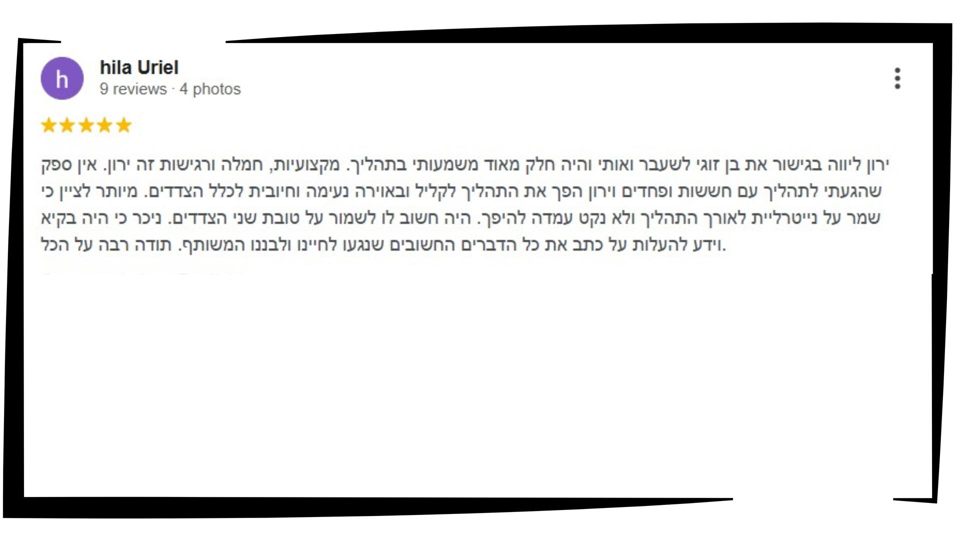 ❤️חוויית תהליך חיובית יותר - התדיינות משפטית היא לעיתים קרובות חוויה מתישה, רגשית ונפשית. גישור, לעומת זאת, מאפשר שיח מכבד, שיתוף פעולה והבנה, מה שהופך אותו לתהליך נעים בהרבה .